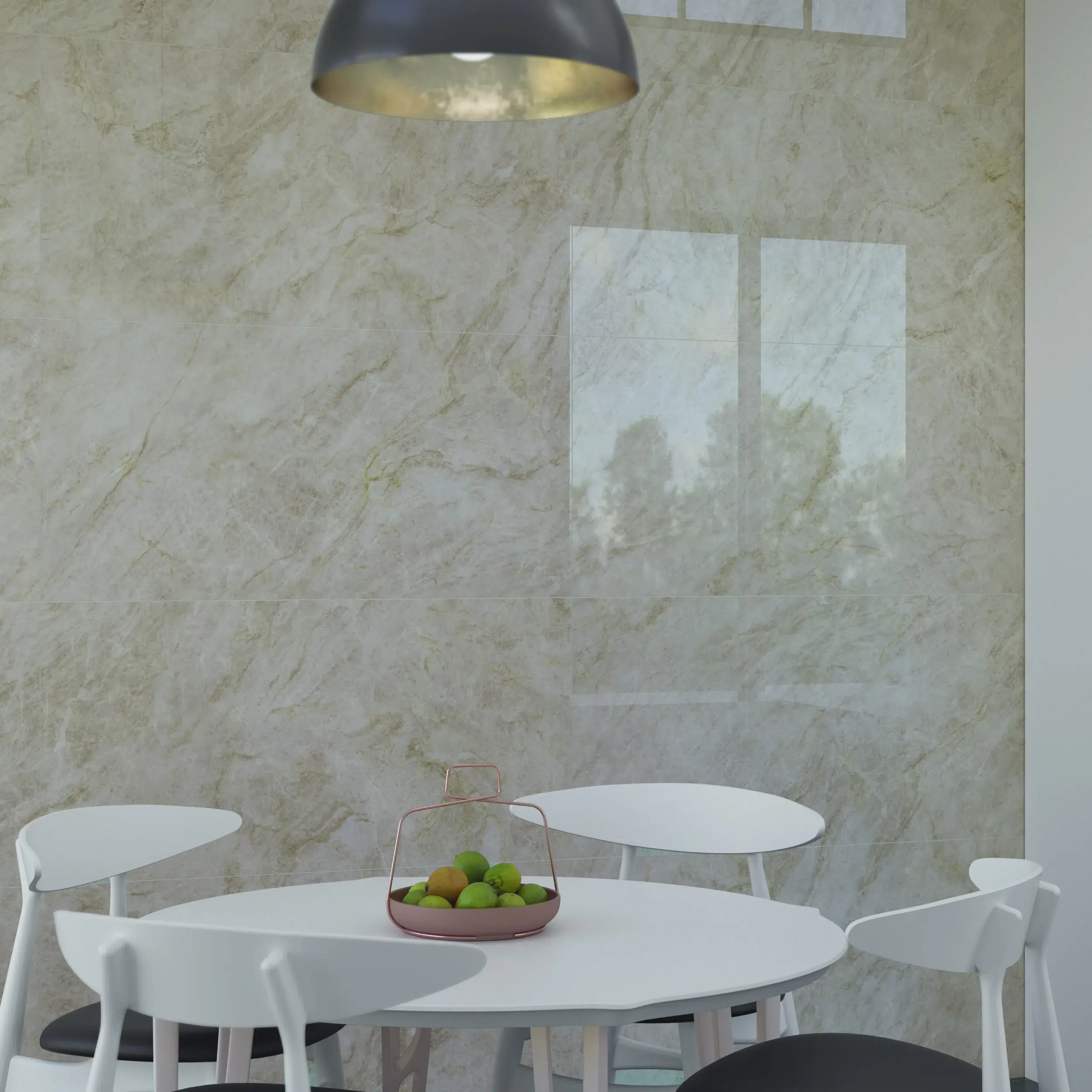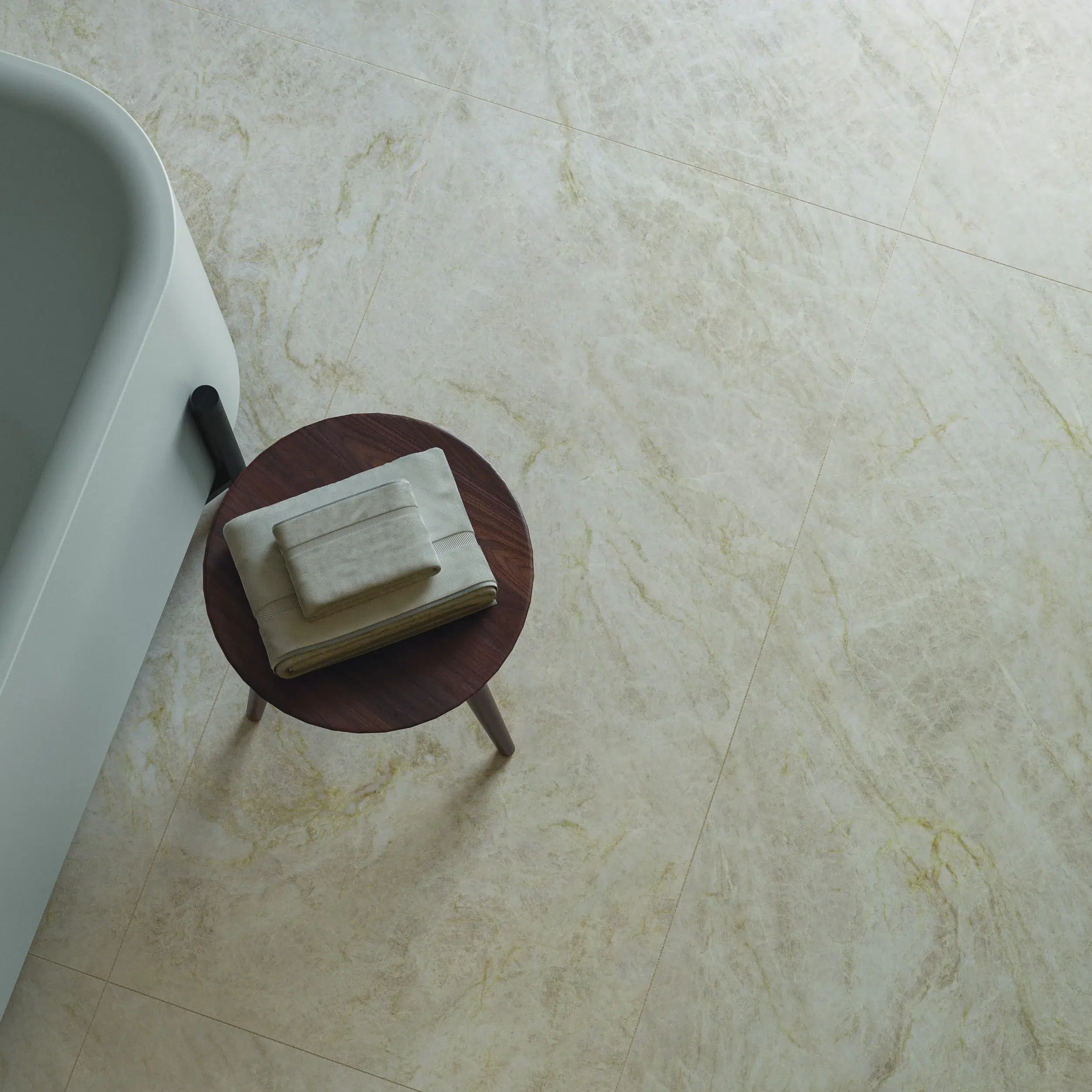 Agra Nature is the definitive expression of the range – a marble-effect porcelain wall tile in a rich, warm ivory base tone traversed by flowing golden veining of exceptional natural realism. The polished glazed surface takes the beauty of the pattern to its absolute maximum, amplifying light and giving every wall surface a mirror-like depth that feels genuinely luxurious at any scale. Used as a full bathroom wall finish or as a hotel-style feature behind a bath or basin, Agra Nature creates an environment of rare elegance and material presence.