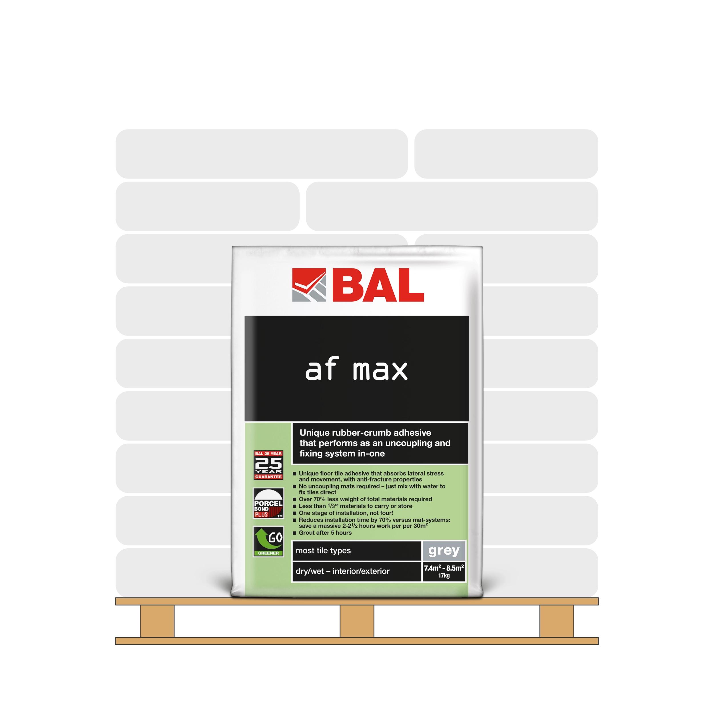 Get unbeatable value with this bulk pallet of 28 bags of BAL AF MAX, the high-yield anti-fracture tile adhesive designed to save time, money, and hassle on site.