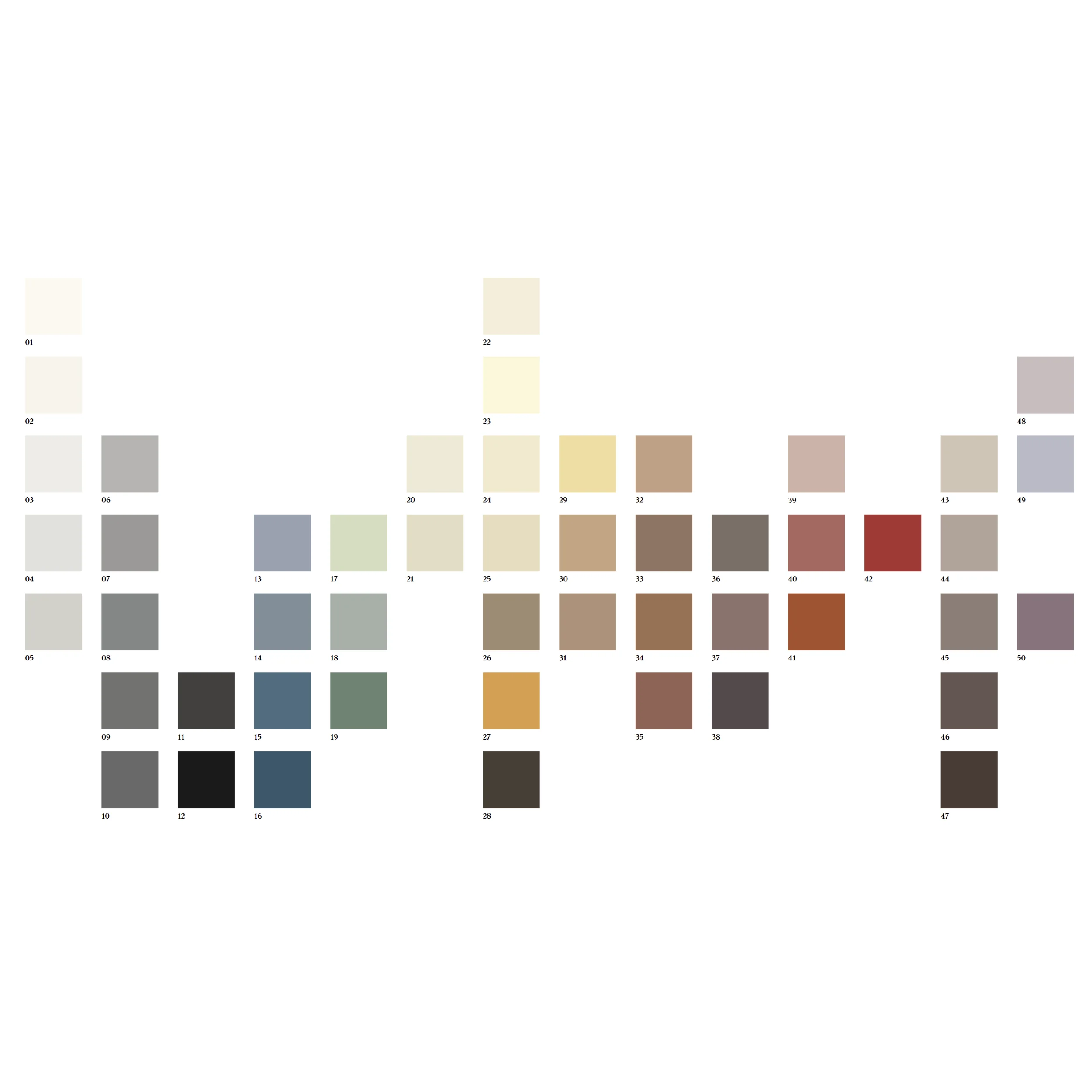 | Colour | Cream, Greige, Mid Grey, Color 01, Color 02, Color 03, Color 04, Color 05, Color 06, Color 07, Color 08, Color 09, Color 10, Color 11, Color 12, Color 14, Color 18, Color 20, Color 21, Color 22, Color 24, Color 25, Color 26, Color 30, Color 31, Color 36, Color 39, Color 43, Color 44, Color 45, Color 46, Dark Grey, Light Grey, White |
