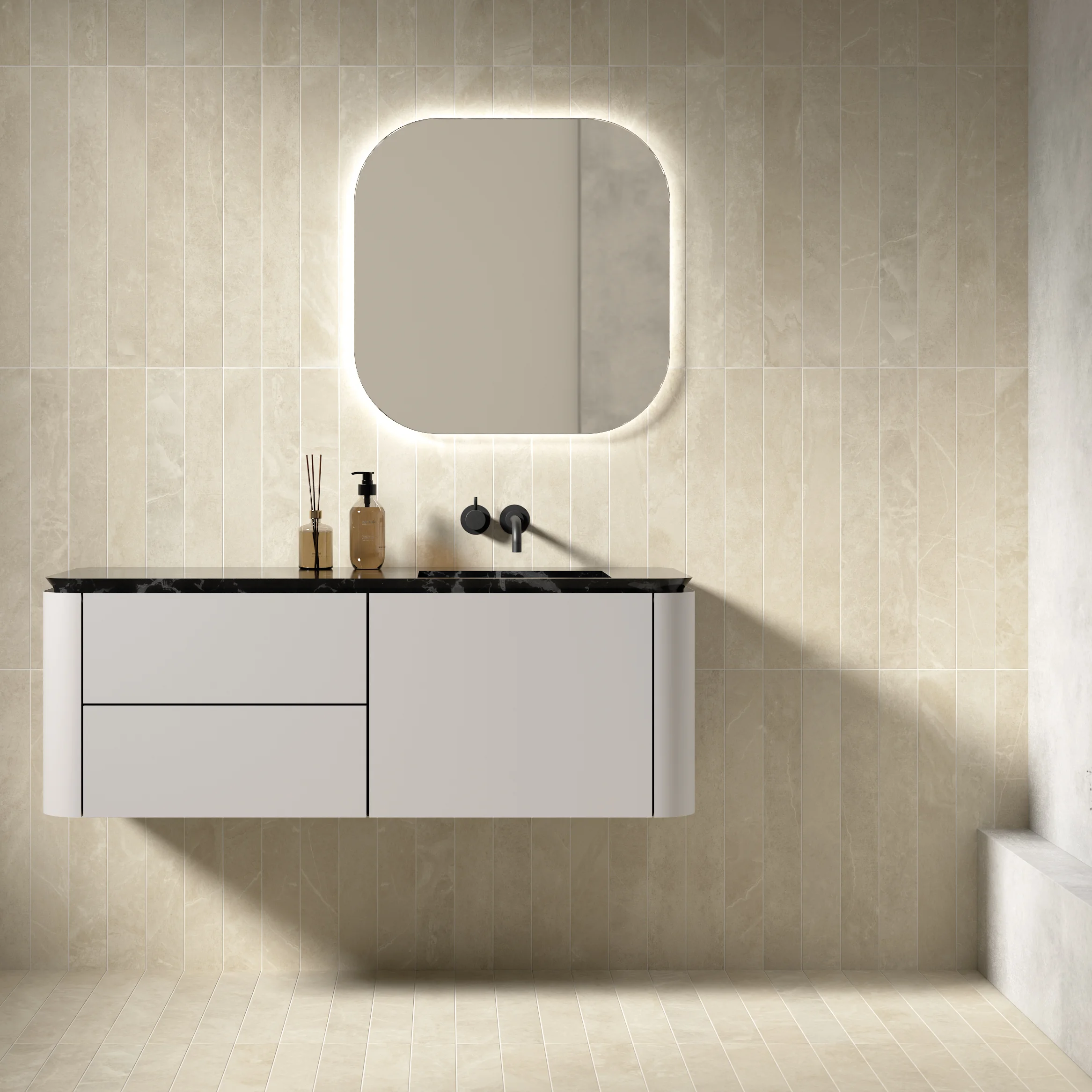 View ShowroomsOdyssey Taupe is a warm, cream-beige stone-effect tile whose natural, earthy tone gives the slim format an inviting, organic quality that works beautifully in bathrooms, kitchen floors, and living areas seeking warmth alongside contemporary design. The delicate stone veining and subtle surface sheen are consistently present across the tile’s high-variation pattern, ensuring every installation feels naturally varied and visually rich – never repetitive, never flat.