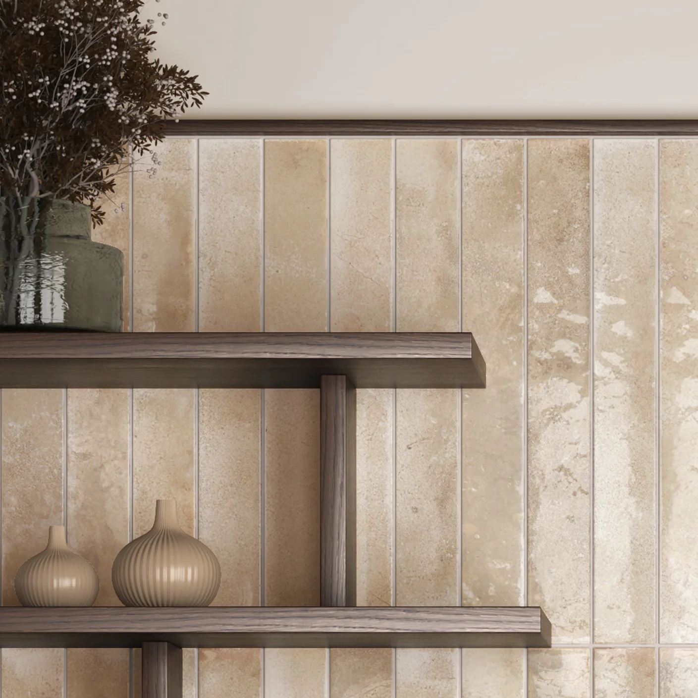 View ShowroomsTuscany Almond is a warm, creamy beige gloss ceramic wall tile that brings a softer, more inviting character to the range’s strong linear format. The glossy finish lifts the warm neutral tone into something luminous and fresh, making it an excellent choice for kitchens and bathrooms where brightness and warmth need to coexist. Its slim proportions create clean, even lines across the wall surface, and its pale, accommodating tone makes it one of the most naturally versatile colourways in the collection.